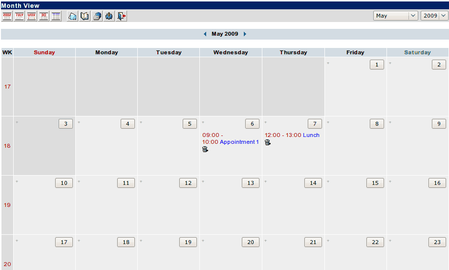 ( ). Depending on your settings in user preference you will then be redirected to the yearly, monthly, weekly, daily or listing calendar page. This is an example of the month view:
